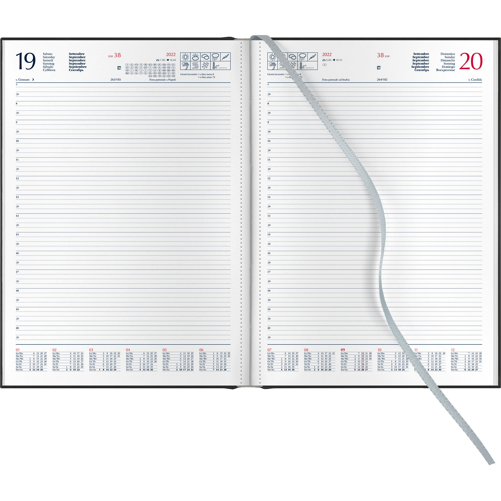 A4 desktop diary with a detailed daily plan, ideal for appointments. International English edition with a Corvara fabric-textured cover.