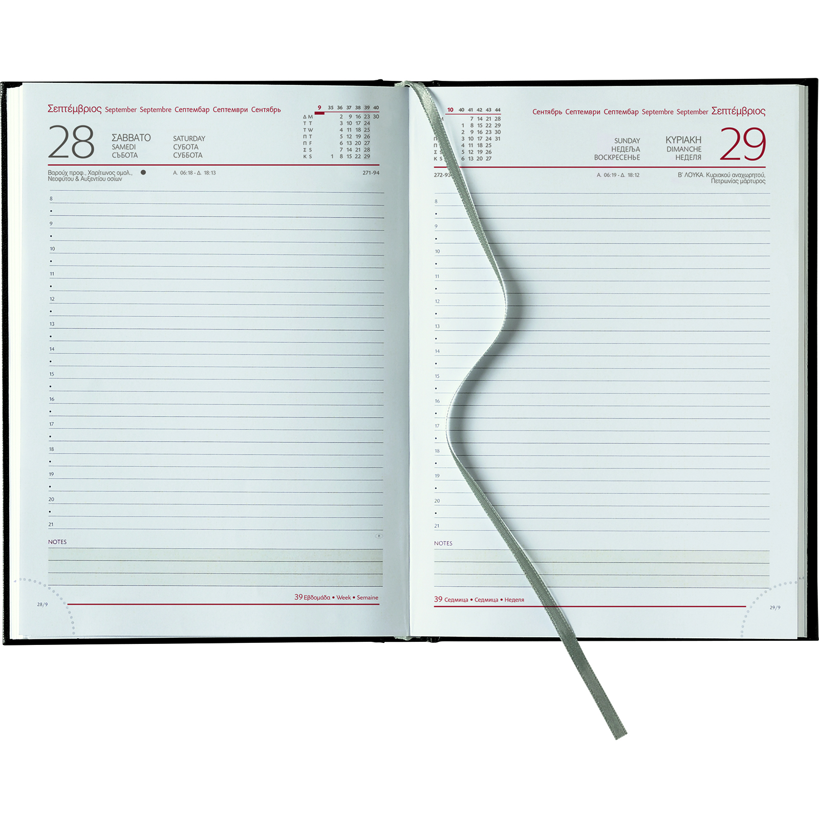 Made from certified FSC paper,Saturday/Sunday on separate pages,Bookmark,Perforated pages,Foil color cover printing