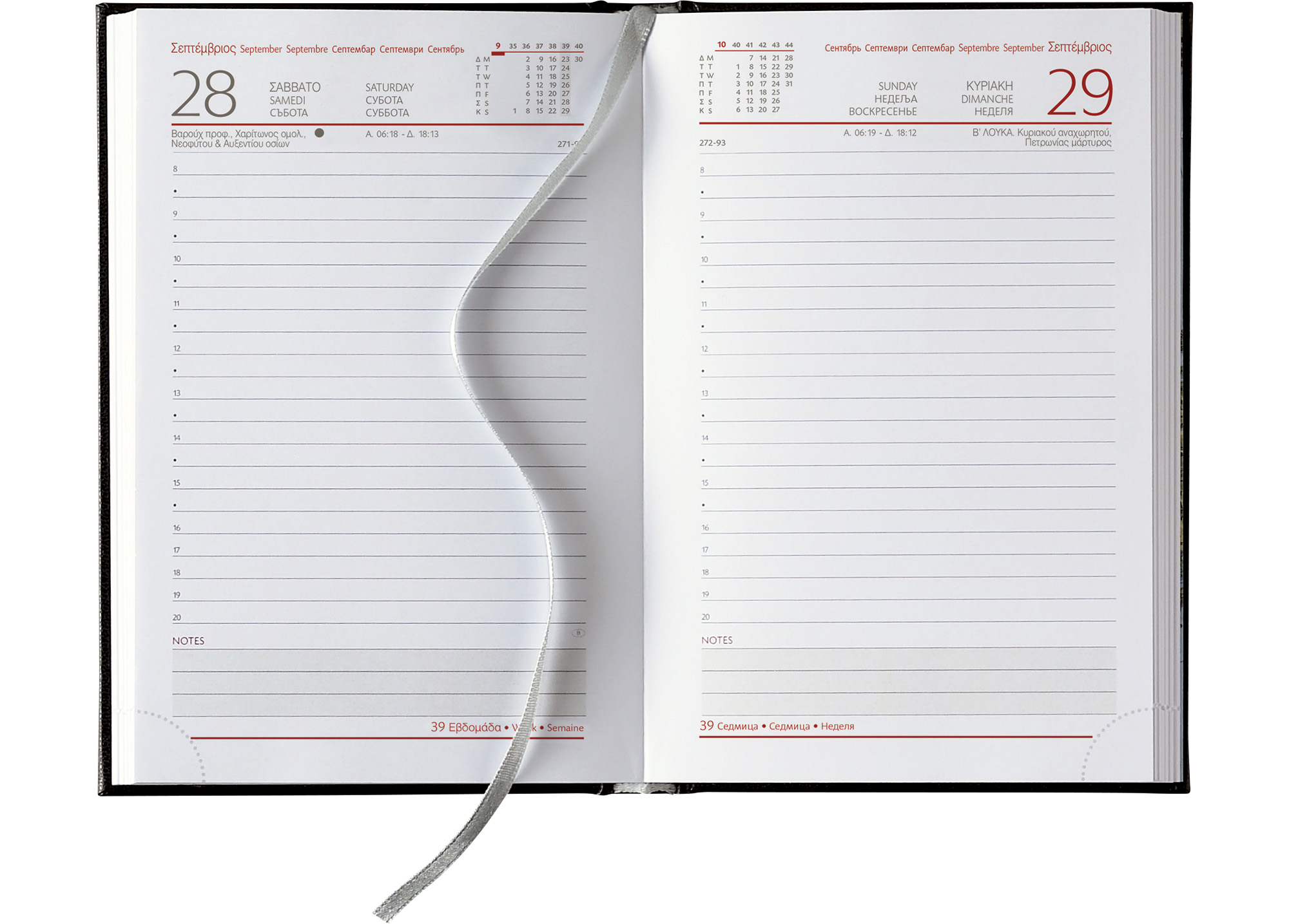 Made from certified FSC paper,Saturday/Sunday on separate pages,Bookmark,Perforated corners,Foil color cover printing